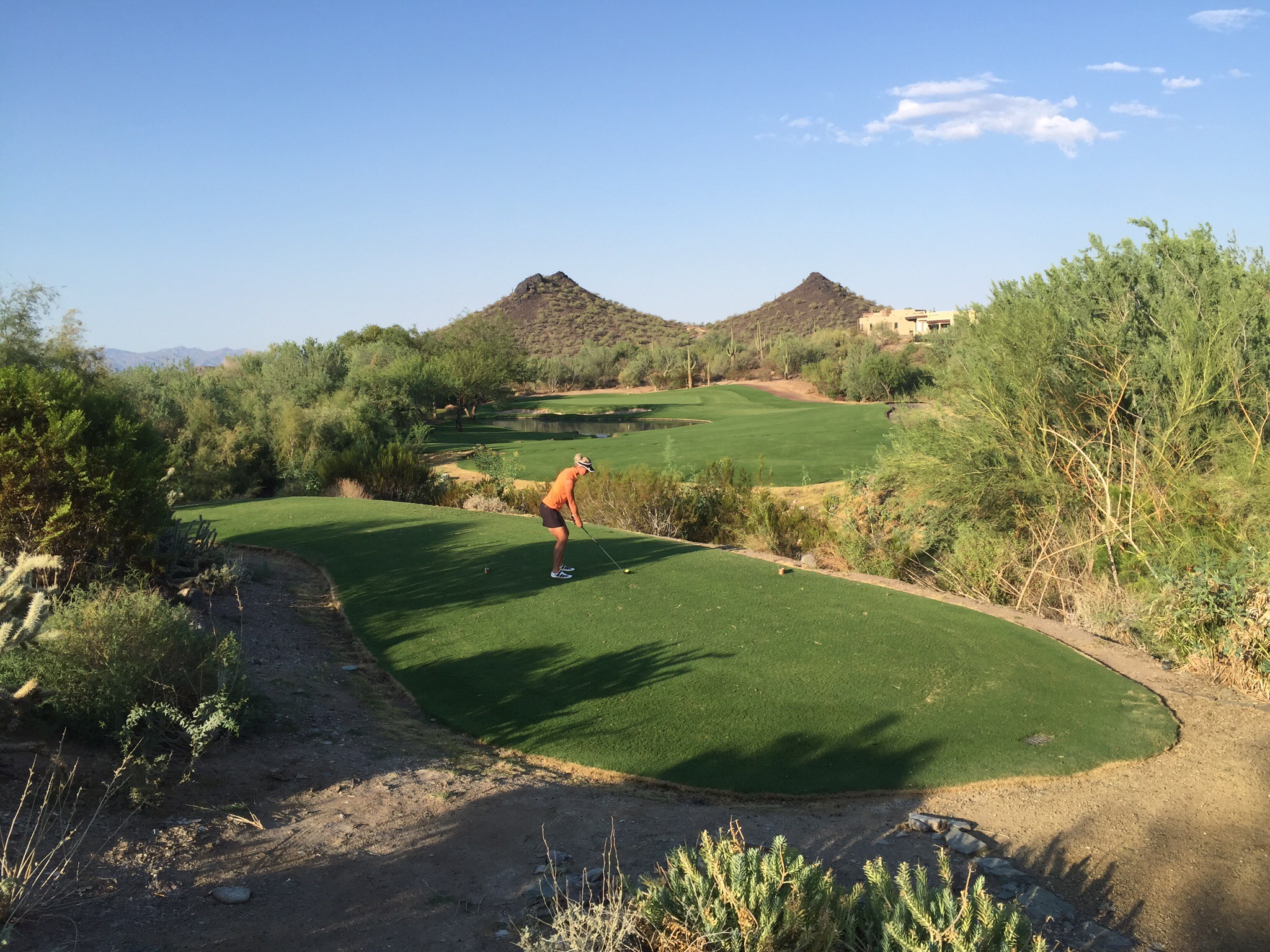 Due to a lot of new road construction and not having updated our GPS we did take a couple of wrong turns enroute to Quintero which meant we were cutting it fine re getting to the course on time.  When we got to the course we checked in and got our clubs loaded onto the cart – the guy in the Pro Shop then said we had a 6 minute drive to get to the first tee!  It all worked out and the Starter introduced us to our playing partners for the day – Ken & Mary from Austin, Texas.