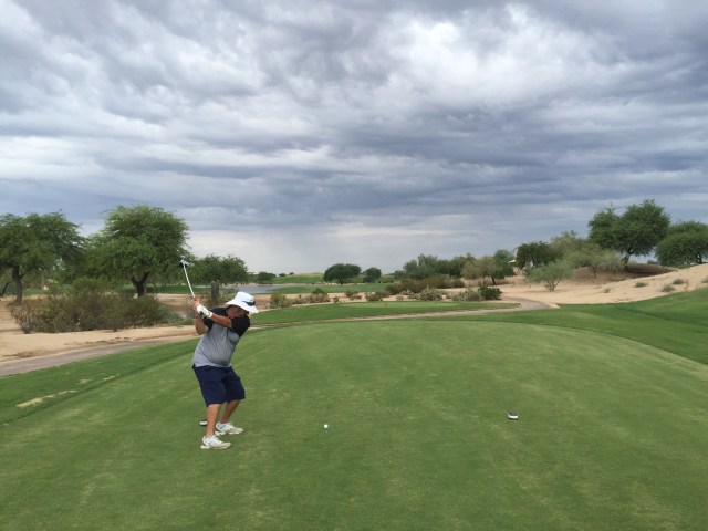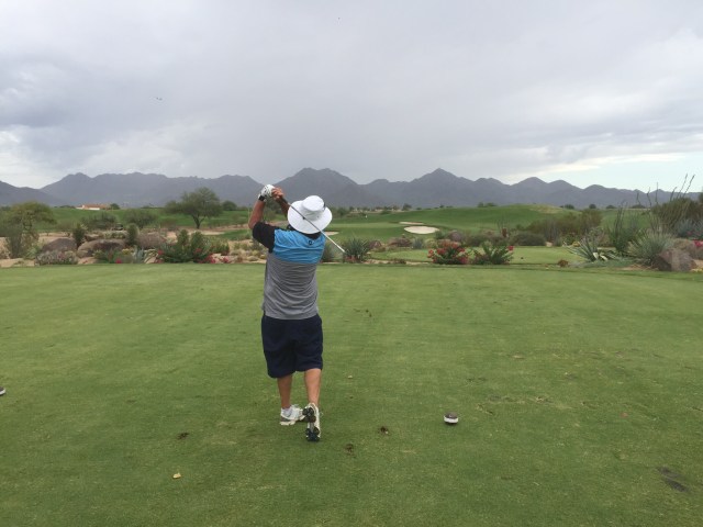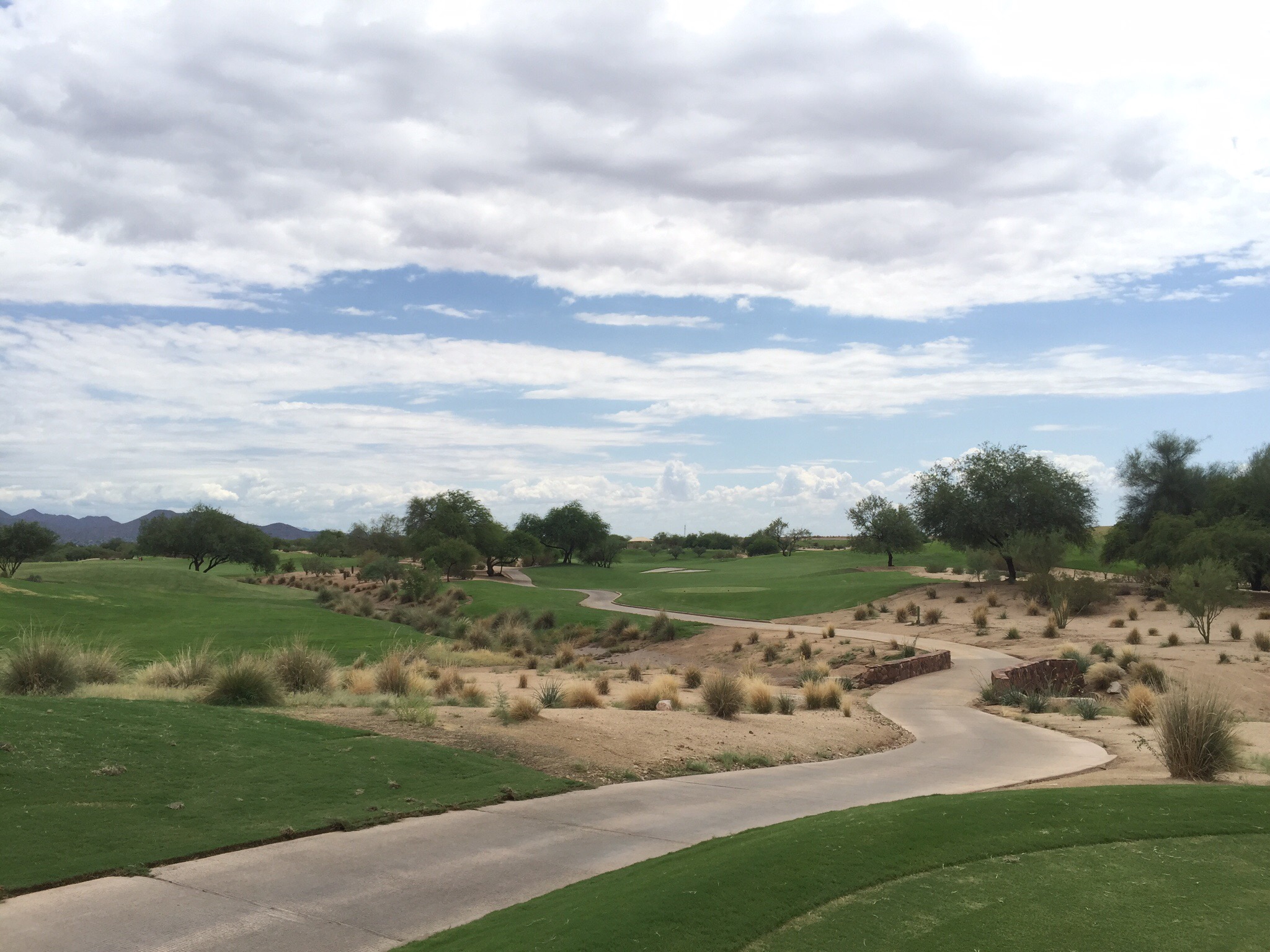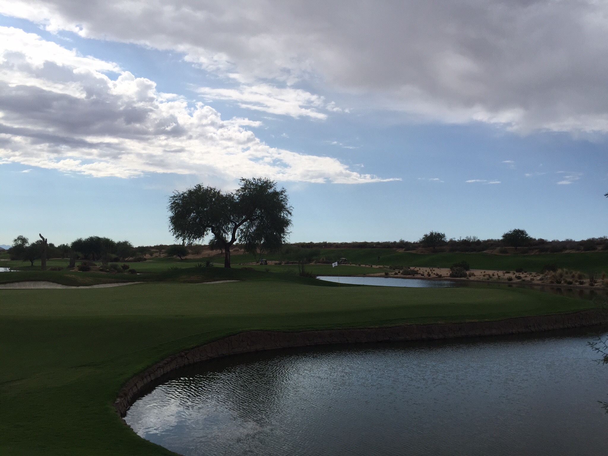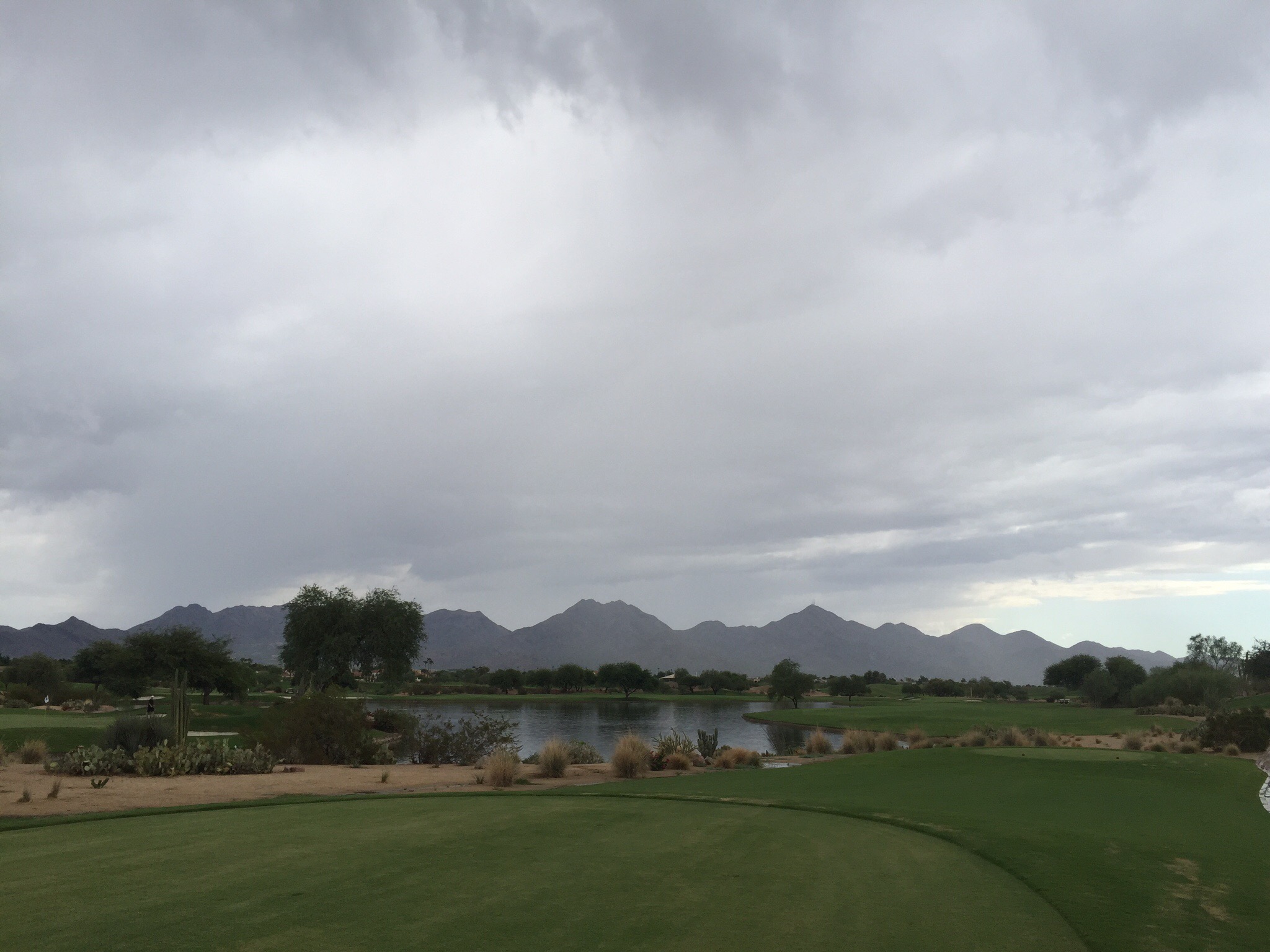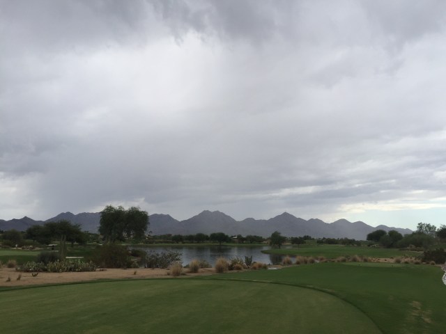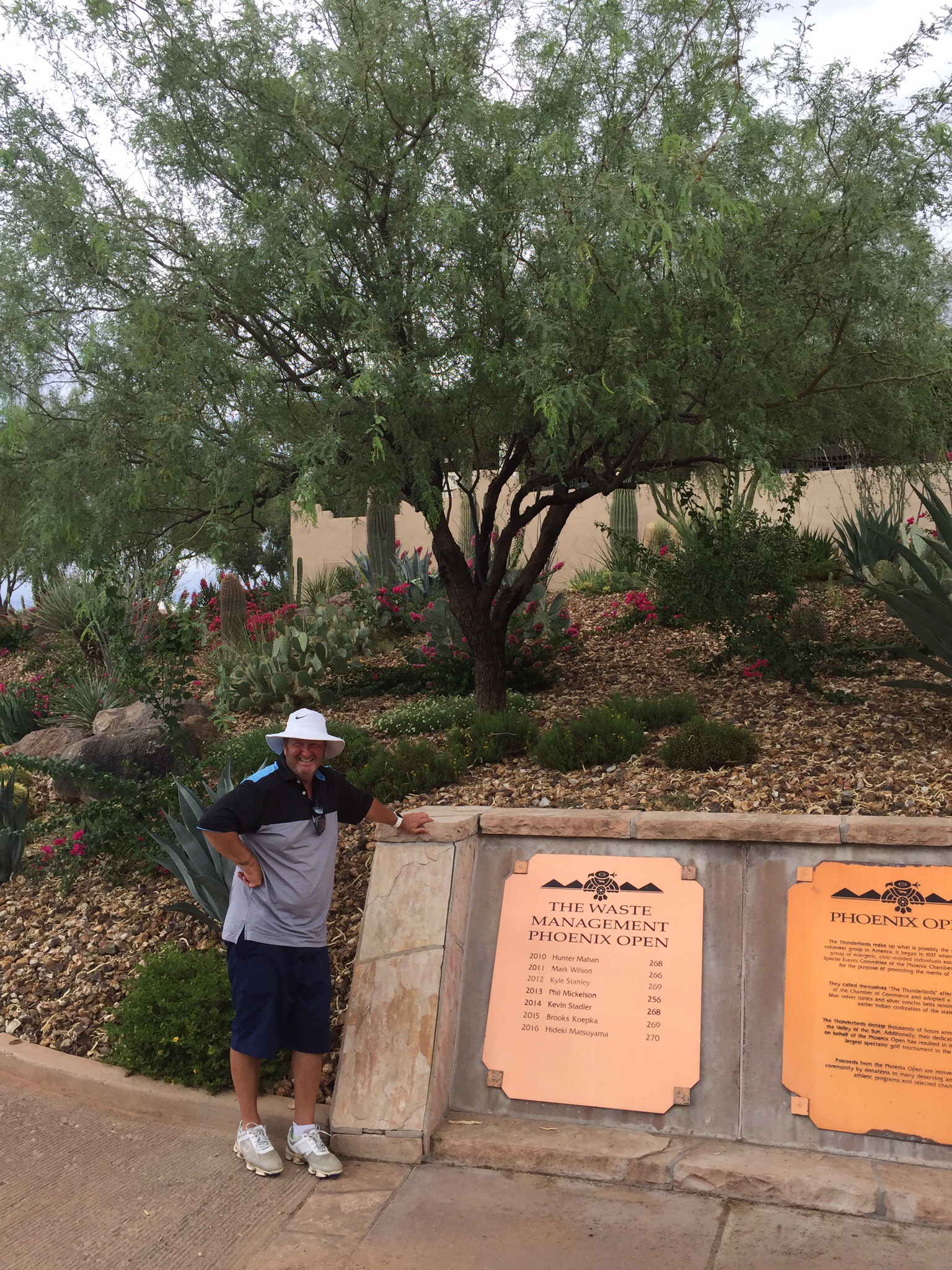 On Tuesday morning we got up at 5.30am so we could make our 7.40am tee time at TPC Scottsdale which is about an hour away. Although we have been here before we had forgotten how big Phoenix is and how busy the motorways are. As we got closer to Scottsdale the motorway signs had weather warnings on them. We were looking around thinking it looked pretty good to us so what are were going on about. We got to the golf course and were told there was an hour’s delay due to the bad weather that had passed through. Some of the cart paths were unpasseable apparently?