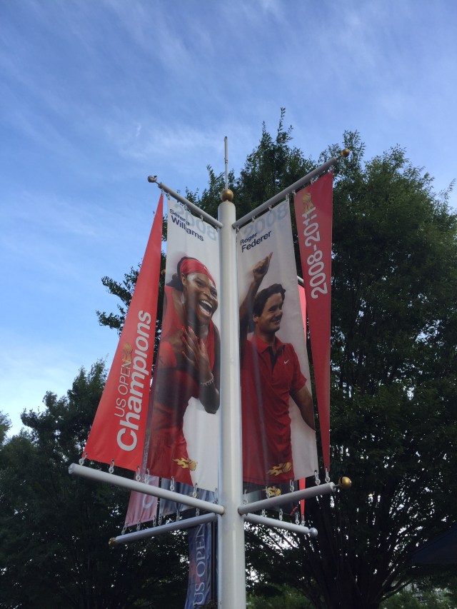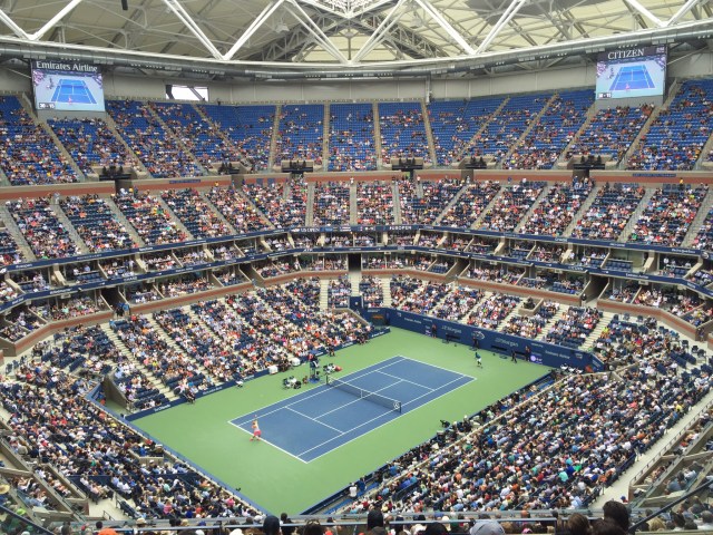 From Kinky Boots to Tennis Shoes as we headed out to Flushing Meadows to watch some round of 16 matches. As I do, I studied the public transport maps and came up with a plan. We were going to walk down to Penn Station and catch the Long Island Light Rail (LILR) out to Mets Willet – two stops, 29 minutes and we would be there. As we were going into Penn Station to buy some tickets these two guys who were selling some sort of tour tickets said to us “I bet you’re going to the tennis” and to Steve ” you look like a golfer” (Steve’s wardrobe basically consists of golf clothes). We said we were and they were like “what are you doing going in here?”. I said we are going to catch the LILR and they said don’t do that it’s too expensive, you gotta catch the 7 train. They were so insistent but very friendly – they pointed us in the direction of the Subway and told us to catch the E train to Times Square and then get on the 7 train. We felt compelled as they were trying so hard to save us money so off we went. I think we saved about USD3.25 each per trip. I had looked at this option and although cheaper it takes nearly twice as long. The other point to note was we had already purchased MetroCards which you can’t use on the LILR. We got to the tennis no problems so all’s well that ends well.