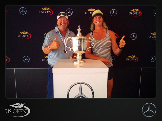 Despite our little faux pas we made it to the tennis in good time and checked out the sponsors displays. Met a Kiwi guy at the Wilson stand, he has been here on a working visa for the past nine months and is loving it. We took part in a fun video shoot with a massive tennis racket. Next stop was the Evian Water stand where I had to tweet something to get a free bottle of water. Someone then told us we could get our photo taken with the trophy at the Mercedes stand so off we went there.