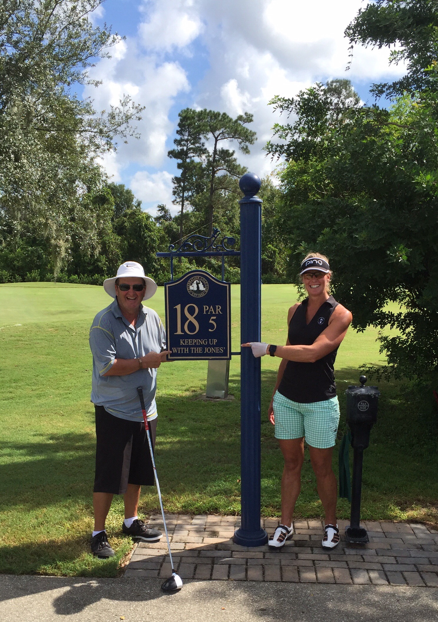 All the holes have names and the 17th is called Alligator Alley. As I saw that sign I remembered last time we played here saw two alligators but none this time. As we were waiting on the tee, Sarah pointed out one in the water – it had just raised it’s eyes above water level. The last hole is called Keeping up with Jones so we had to have another photo here for our friends Marion & Warwick Jones : )