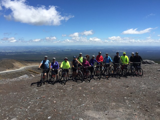 We had engaged Ted from Tread Routes in Taupo as our guide, rental bike and luggage transport extraordinaire. He met us in Ohakune at 1pm on the Friday and sorted those that were renting bikes out. We then all jumped in the van for the trip up to the Turoa Skifield. Stage one of day one was a 17km descent down the mountain road. The weather was perfect and the mountain greeted us in all her glory.