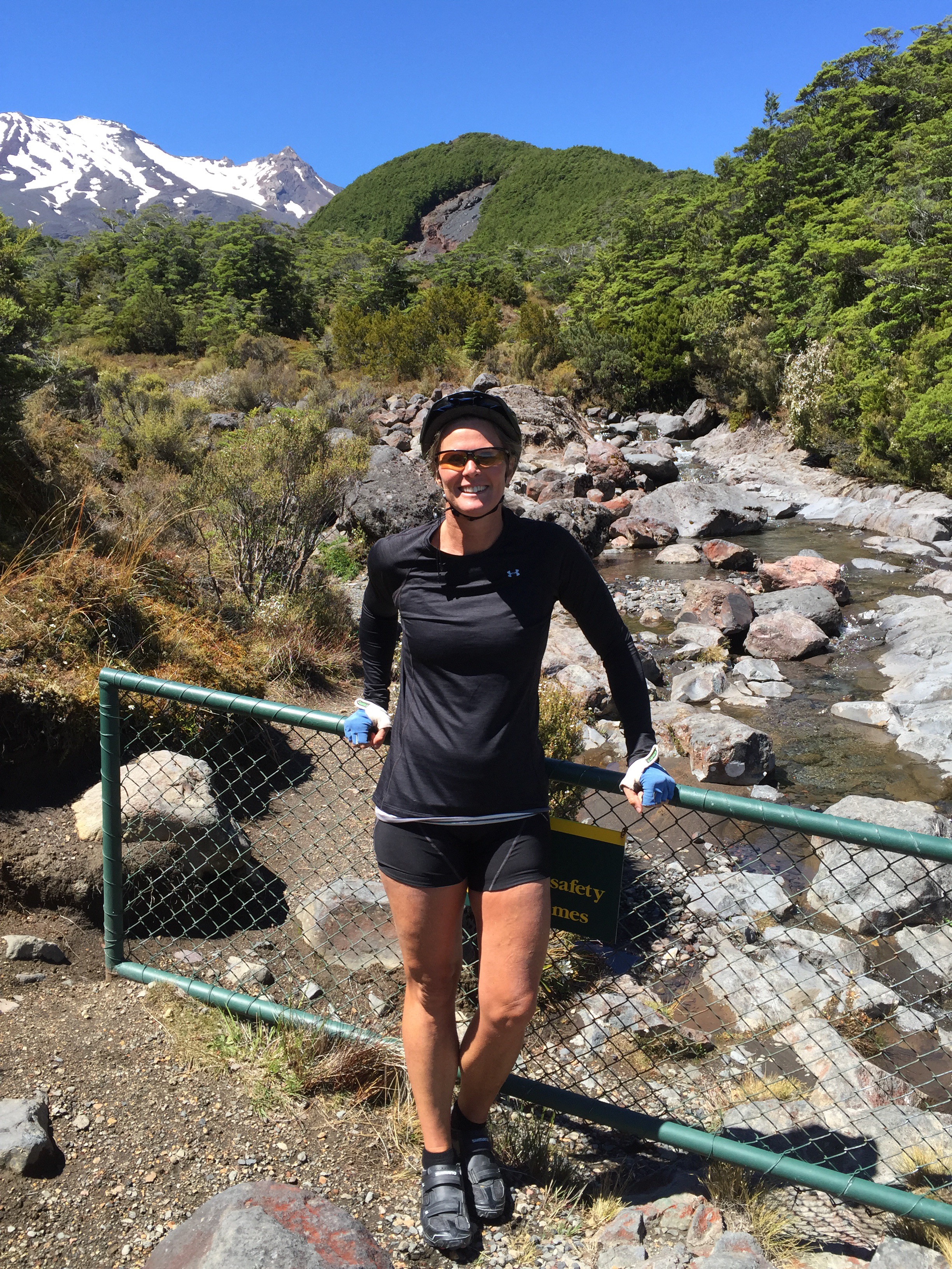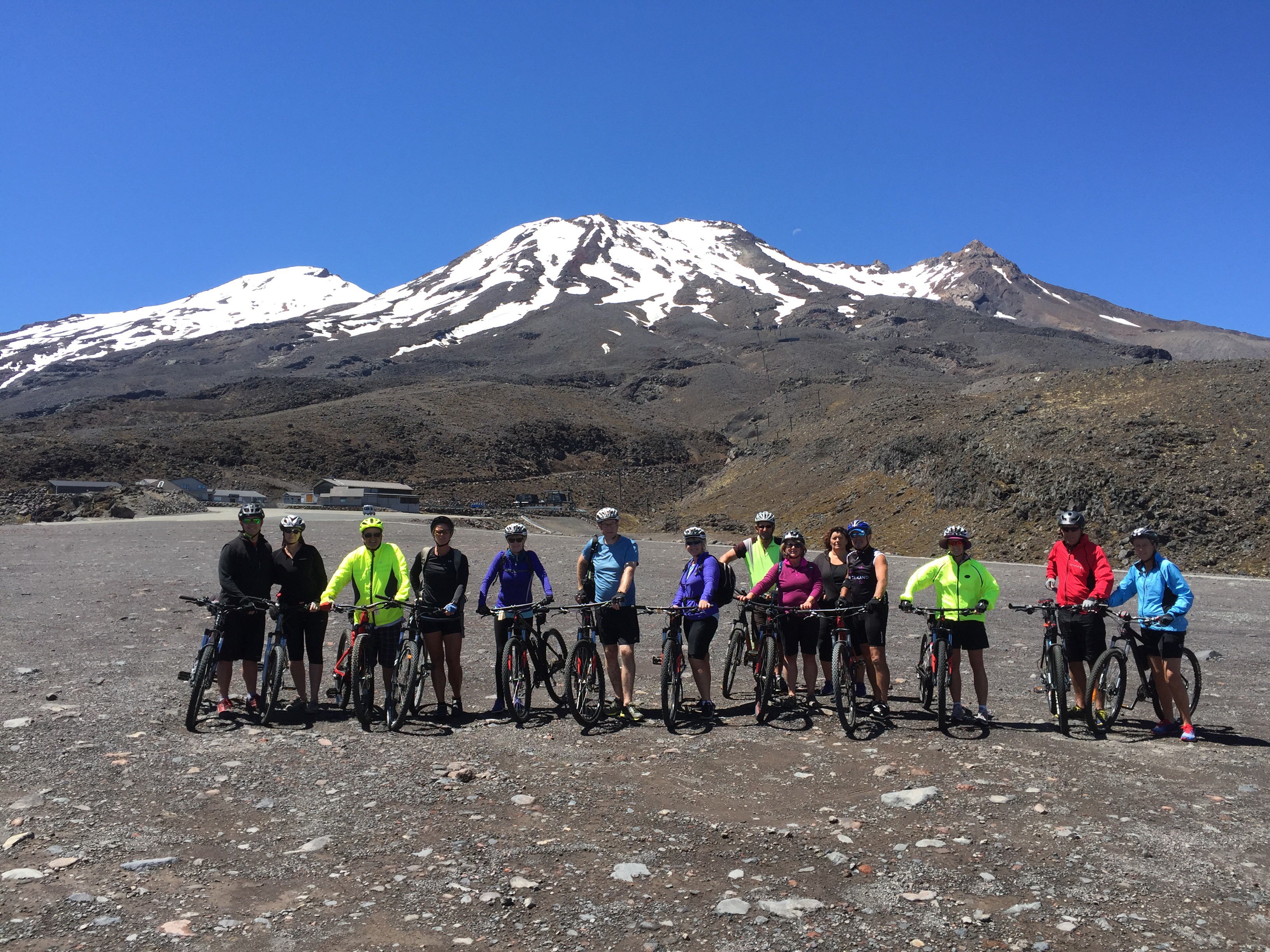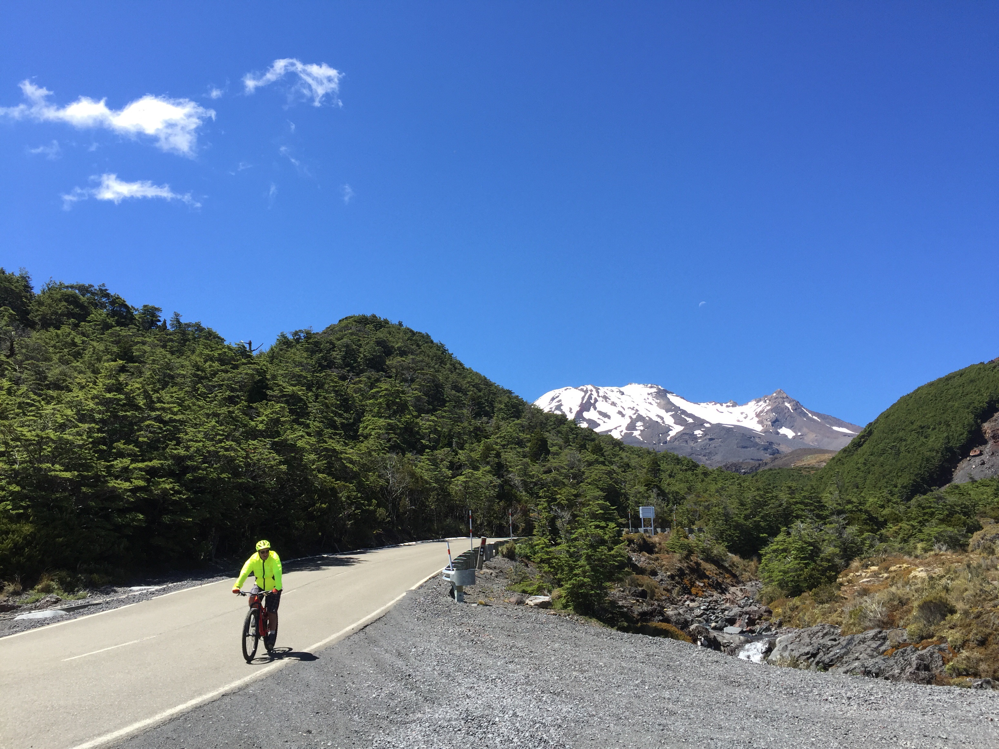We had engaged Ted from Tread Routes in Taupo as our guide, rental bike and luggage transport extraordinaire. He met us in Ohakune at 1pm on the Friday and sorted those that were renting bikes out. We then all jumped in the van for the trip up to the Turoa Skifield. Stage one of day one was a 17km descent down the mountain road. The weather was perfect and the mountain greeted us in all her glory.