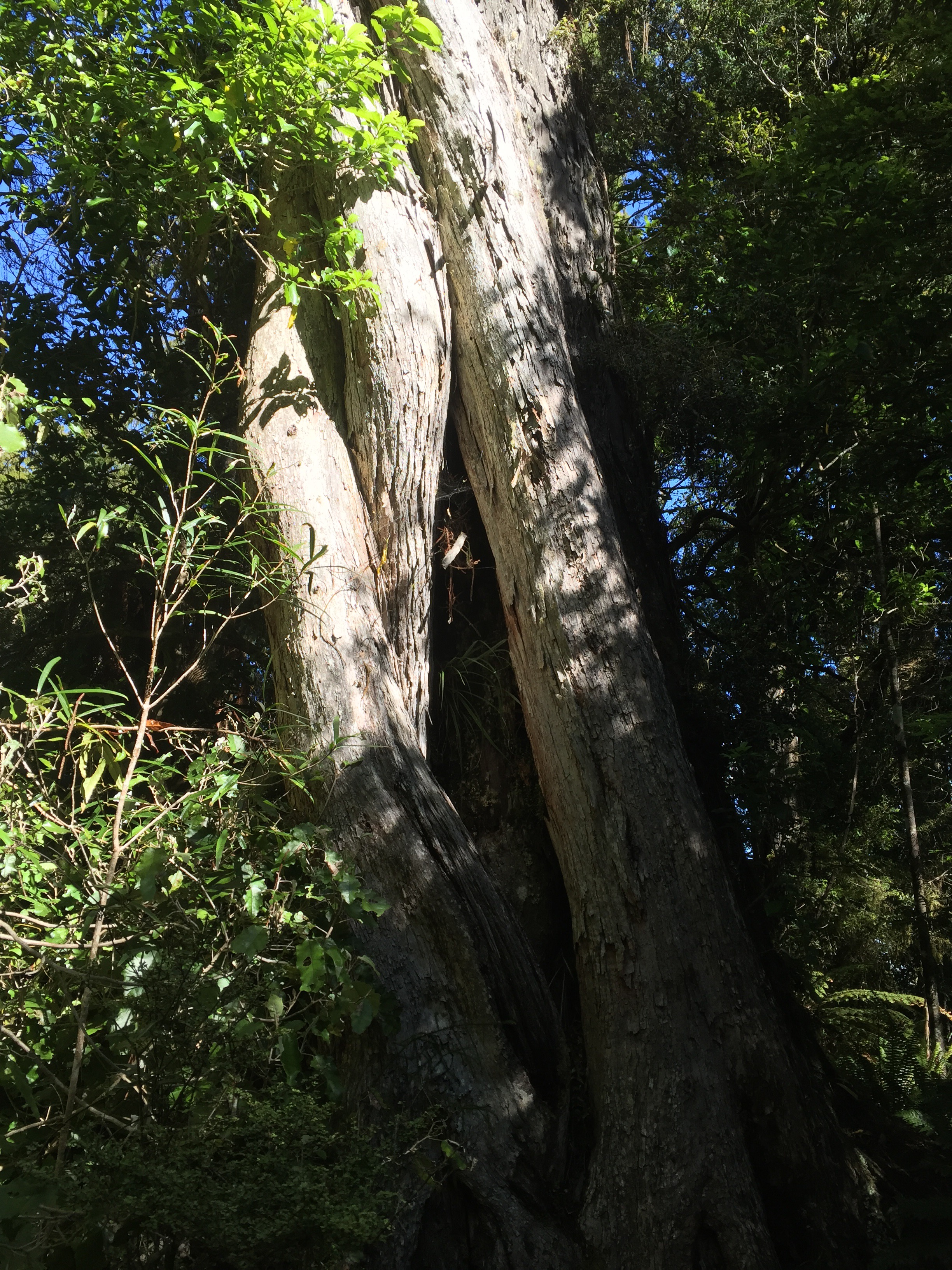 Rata and rimu are two endemic New Zealand trees with a close relationship. Rata starts life as an epiphyte (a parasite growing in the branches of a tree) – and it often chooses rimu. The rata roots then reach down to the ground and the vine thickens, slowly encasing and choking the host tree until the rata can stand alone. That’s why mature rata trees always have a hollow core – it’s the imprint of the tree that provided all the support!