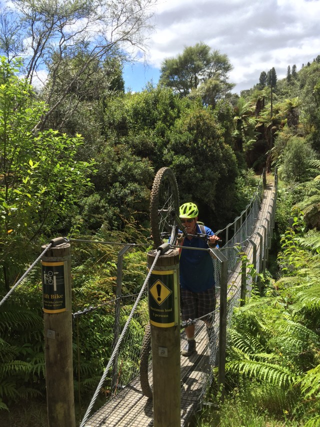 The last 13km provided some challenges with the track becoming narrow as it skirted the bluffs. There were a number of parts where we had to dismount and walk the bikes. There are also seven swing bridges to cross which involve tipping your bike up on it’s back wheel and pushing it over the bridges like that. We all became quite expert at doing this by the end of the day.