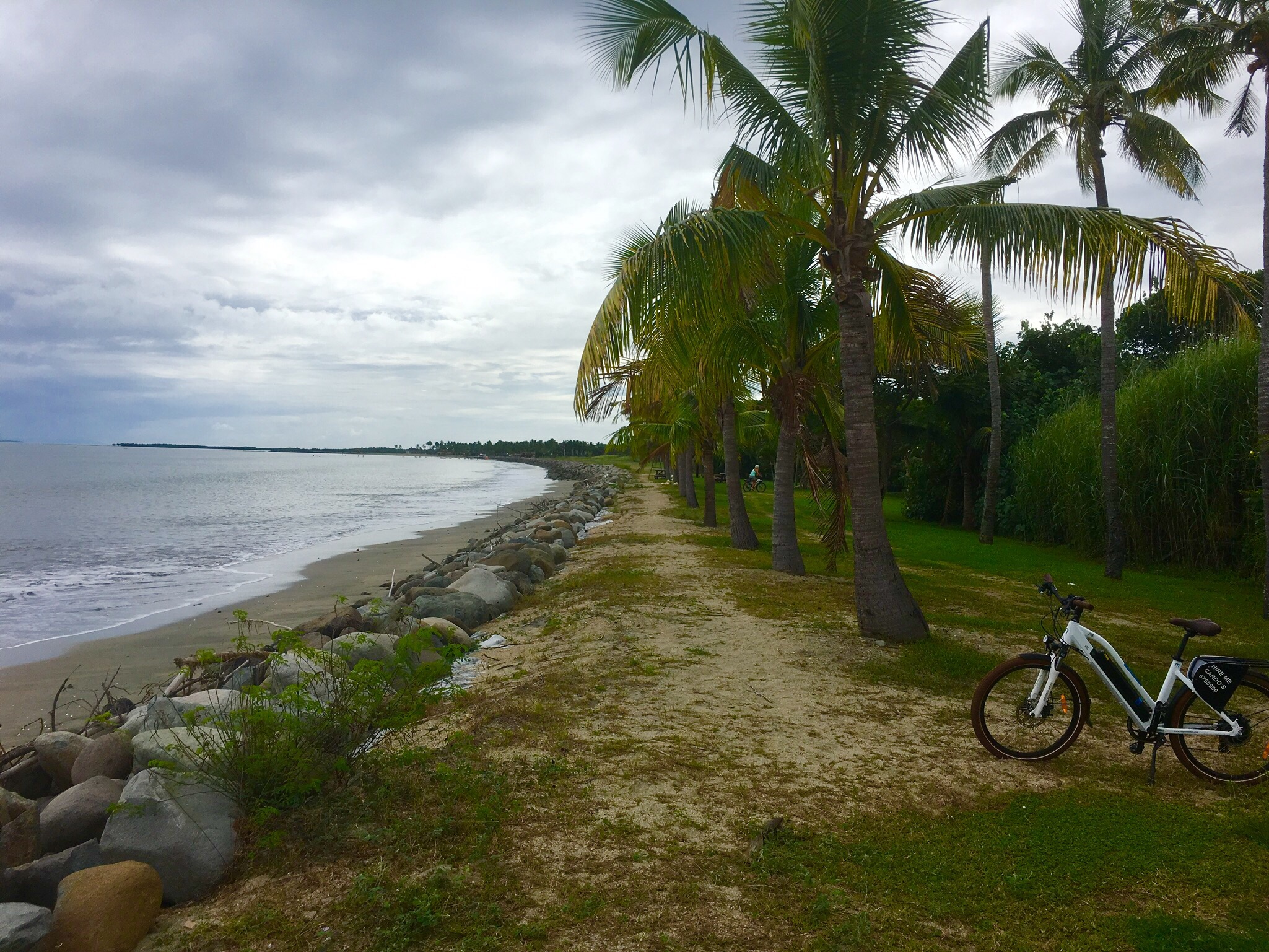 On our last full day in Denerau we hired some electric bikes and did a bit of a ticky tour around – to be honest you can’t go too far but it was fun. The cost to hire the electric bikes was FJ9 or NZD7 per hour – that is so cheap. OK they weren’t the flashiest bikes but they went alright. We had a blast cruising around and ducking into gated communities with a smile and a wave to the security guards – just act like you belong there and they don’t seem to mind. Fake it till you make it as the saying goes. We did a bit of off road and ended up at the back of the golf course next to the sea.