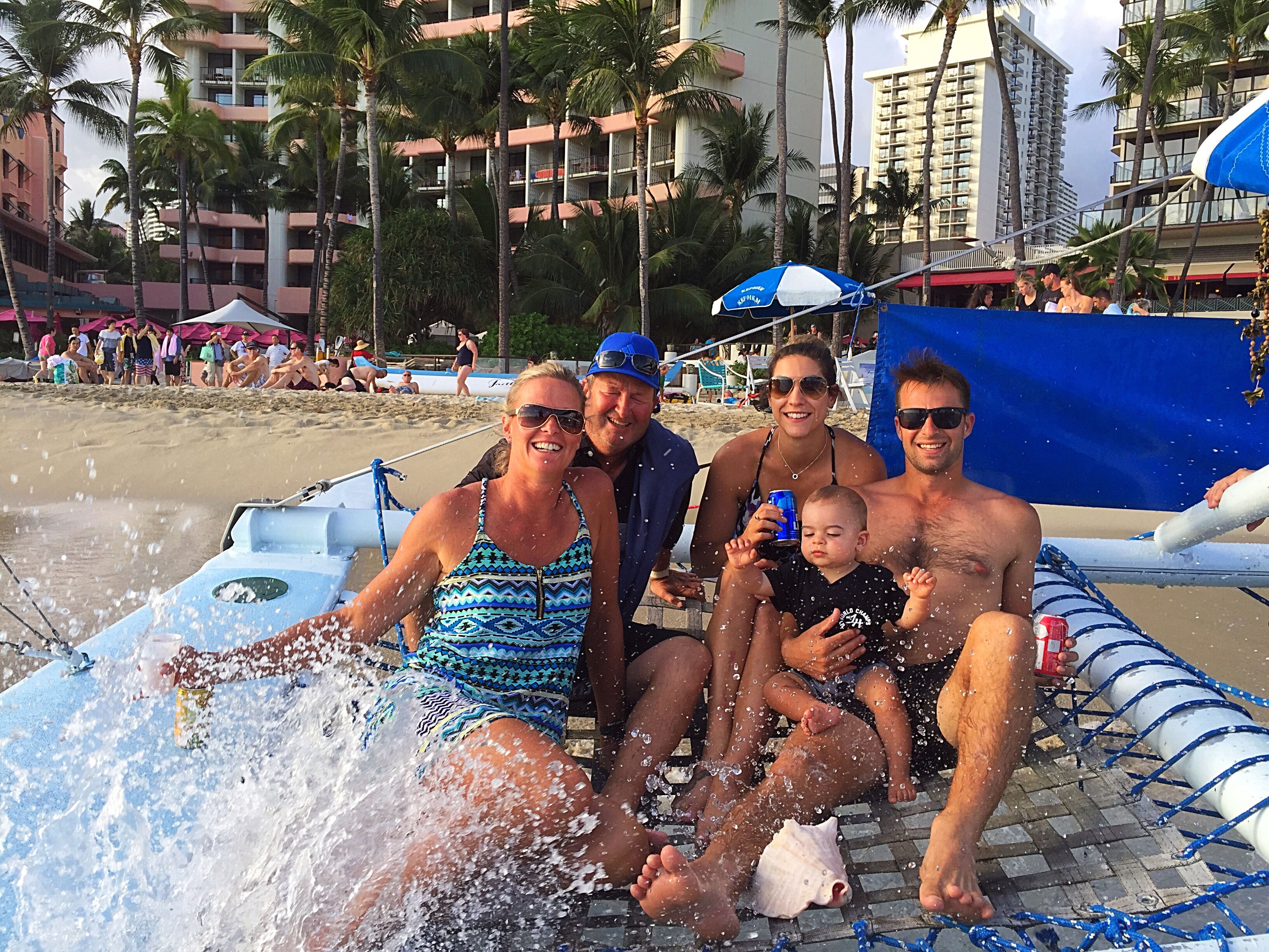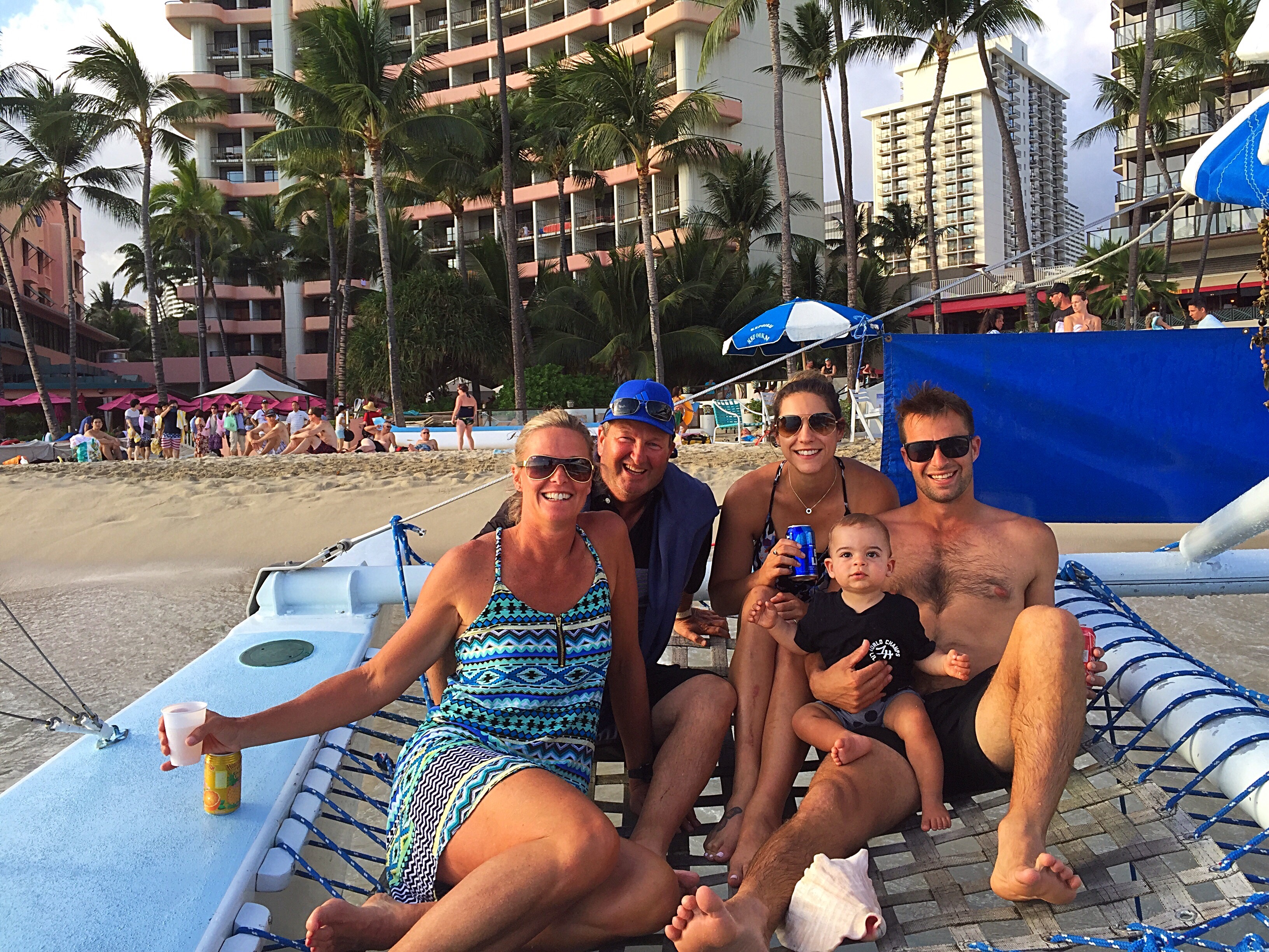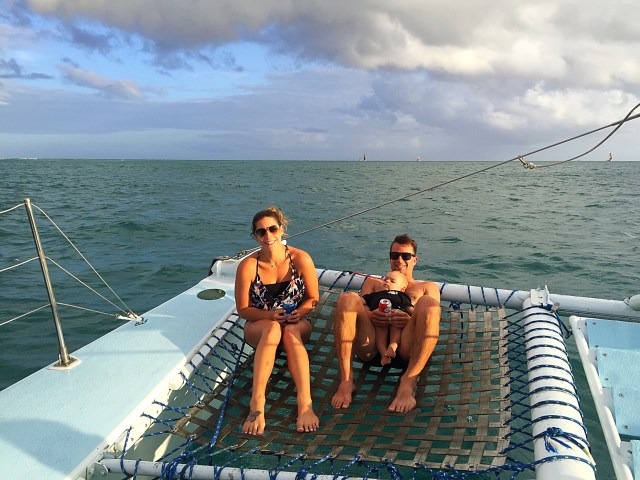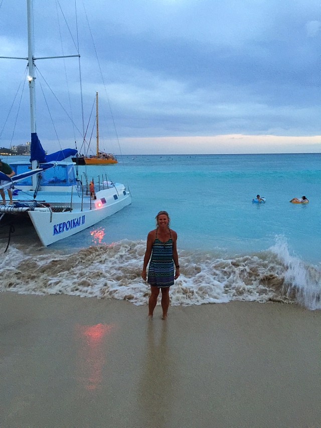 Next stop was Waikiki Beach where we had booked a sunset cruise on a catamaran that left from the beach. The traffic turned out to be a bit of a nightmare so we only had about 15 minutes to spare to get down to the beach. The crew were a pretty relaxed lot and we didn’t leave ontime anyway! They warned us before we got on that the waves crashing in on the shore were causing people to get a little wet while they waited on the boat. Steve managed to get fairly wet just hopping on the boat – a wave crashed on the beach just as he was climbing the stairs.