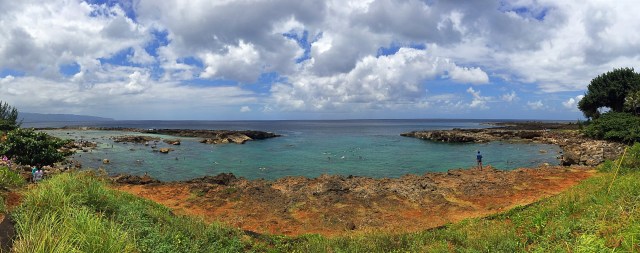 We only had two full days to explore Oahu so the plan on day one was to head to the North Shore beaches along the eastern coast. We stopped off at Shark Cove which is a popular snorkelling spot. It has a lava rock beach and is unique not only because of it’s spectacular underwater rock formations, but also because of its diverse marine life. Apparently the lava has formed underwater caves and tunnels about 15 to 45 feet below the surface which are great for experienced scuba divers. Both Ashleigh and Paul went for a snorkel – I just had a dip in the water to cool off.