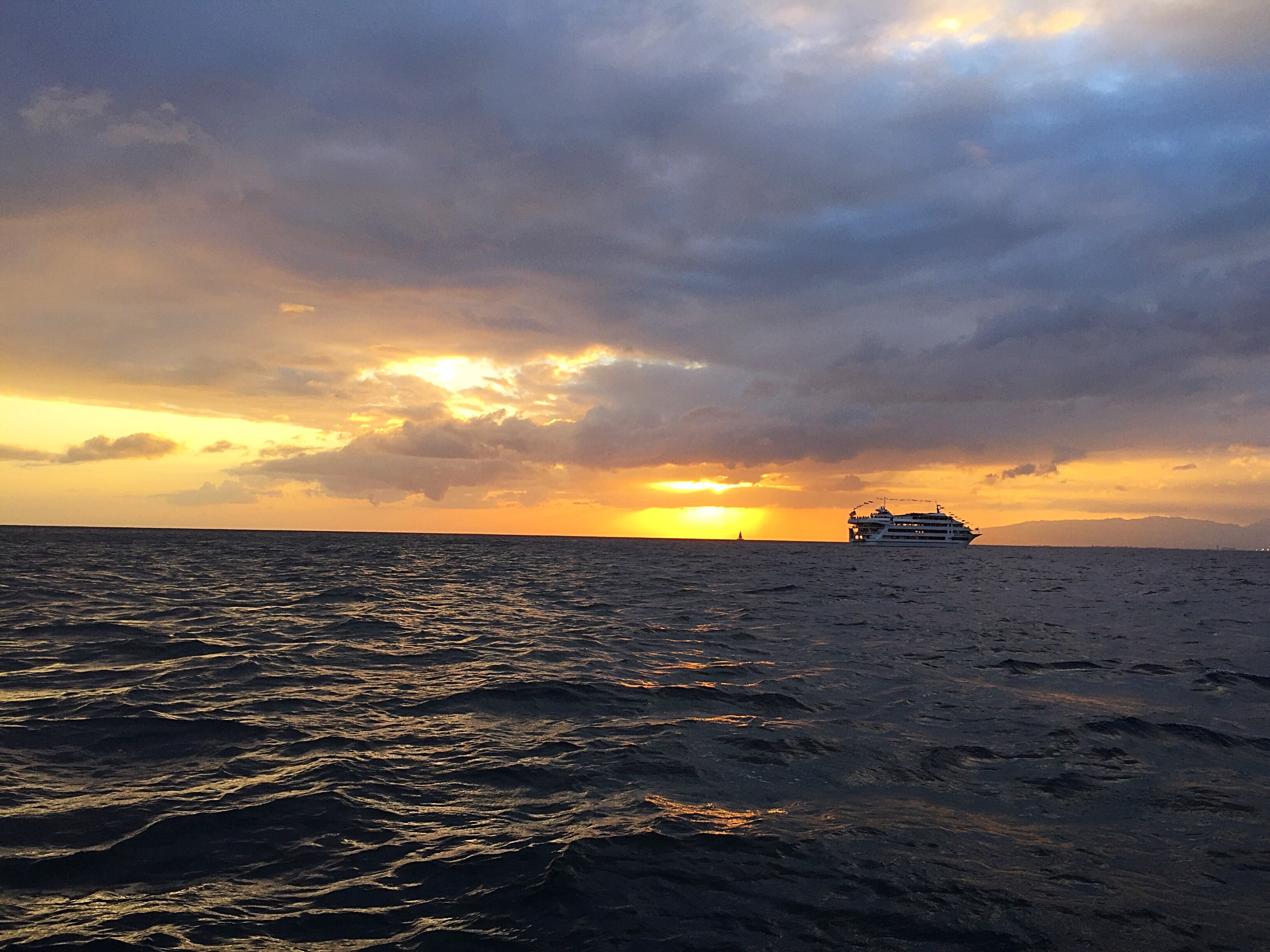 Again Ashleigh had done this exact same trip two years earlier and she said it had been dead calm – they were fully clothed and didn’t get wet at all. She had a Mumma Bear moment when it got a bit rocky out there fearing for Taj. The crew reassured her it was fine and it wasn’t long before we turned around. The water crashing over me was warm but the air was getting a bit cooler so I was getting a bit chilly. It was great fun. Just as the sun was going down this three story cruise boat cruising out in the harbour blocked our view 😬
