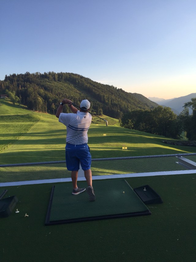 We got home just in time to meet the delivery van. Reunited with our clubs we went to the driving range at Burgenstock which sits at about 800 metres above sea level. Another beautiful evening. We hit balls and then had a chipping competition which the girls won 👍🏻.
