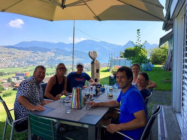 We enjoyed a coffee and some snacks with Sandra, Sep and two of their kids – Simon and Sarah. Steve and Simon were being silly which resulted in Simon falling in the pool fully clothed : 0. They have a great view over the Pilatus airport and down towards Engleberg and Buochs.