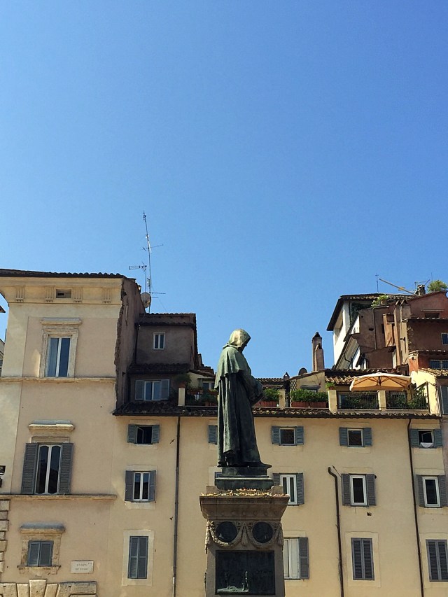 Executions used to be held publicly in Campo de’ Fiori. Here, on 17 February 1600, the philosopher Giordano Bruno was burnt alive for heresy, and all of his works were placed on the Index of Forbidden Books by the Holy Office. In 1889, Ettore Ferrari dedicated a monument to him on the exact spot of his death: He stands defiantly facing the Vatican and was regarded in the first days of a reunited Italy as a martyr to freedom of thought. The inscription on the base reads: A BRUNO – IL SECOLO DA LUI DIVINATO – QUI DOVE IL ROGO ARSE (“To Bruno – the century predicted by him – here where the fire burned”).
