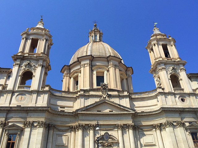 We then visited the beautiful Piazza Navona which has three elaborate fountains. Defined as a public space in the last years of 15th century, when the city market was transferred there from the Campidoglio, Piazza Navona was transformed into a highly significant example of Baroque Roman architecture and art during the pontificate of Innocent X, who reigned from 1644 until 1655, and whose family palace, the Palazzo Pamphili, faced the piazza. It features important sculptural and creations: in the center stands the famous Fontana dei Quattro Fiumi or Fountain of the Four Rivers (1651) by Gian Lorenzo Bernini, topped by the Obelisk of Domitian, brought in pieces from the Circus of Maxentius; the church of Sant’Agnese in Agone by Francesco Borromini, Girolamo Rainaldi, Carlo Rainaldi and others; and the aforementioned Pamphili palace, also by Girolamo Rainaldi, that accommodates the long gallery designed by Borromini and frescoed by Pietro da Cortona.
