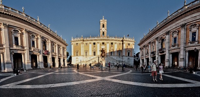 Michelangelo came up with an original, trapezoidal design for the square with an intriguing oval shaped ground pattern. He rebuilt the Palazzo Senatorio, seat of the Roman senate, and redesigned the facade of the Palazzo dei Conservatori.