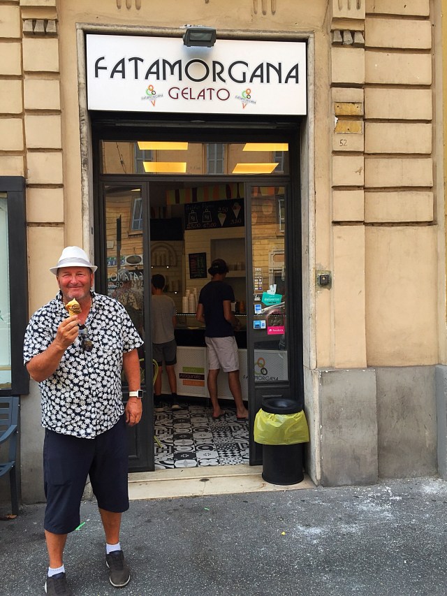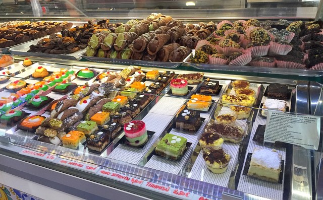 The pastry we enjoyed was a cannolo which is a Sicilian specialty – made from flour, cocoa powder and water – they are deep fried and rolled into a tube like a cannelloni. They are then filled with ricotta cheese and dipped in a topping like pistachios, almonds, hazelnuts, cherries etc… I had candied orange – not bad although I’d take porridge any day of the week.