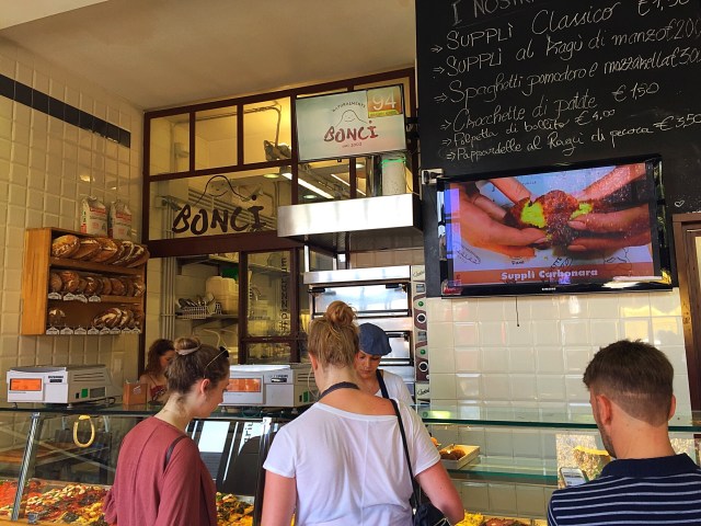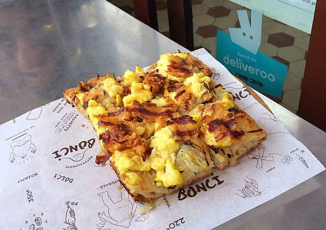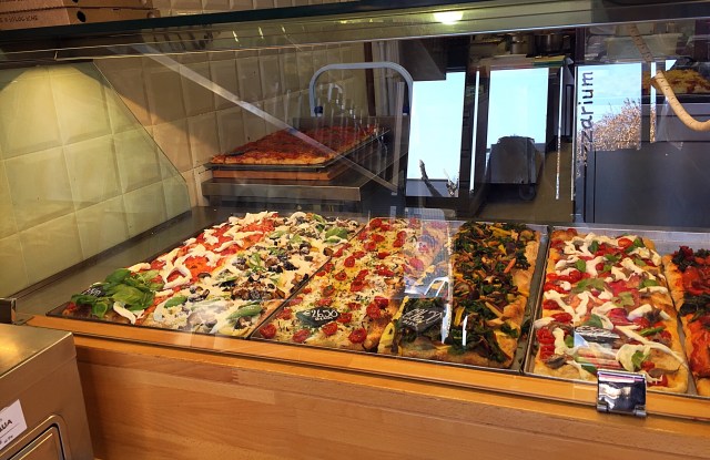 It was now 11am and time for pizza and not just any pizza but Bonci pizza. Rome’s esteemed pizzaiolo Gabriele Bonci (pronounced Bahn-chi) creates pizzas that are so delicious, so creative, and so visually stunning that he has developed a fanatical following not only in Italy, but around the globe.