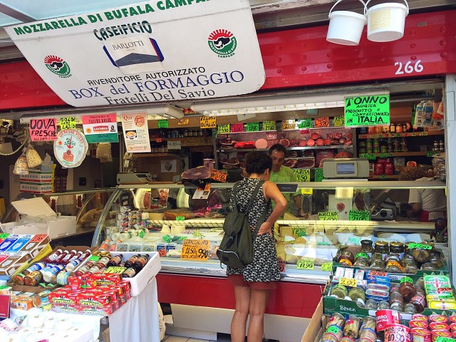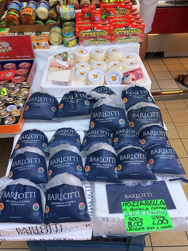 The market was actually very quiet when we visited as a lot of the stall holders were on holiday – August is the month when the Italians go on holiday. The cheese stall was open though and we were able to sample buffalo mozzarella from Amalfi. Buffalo mozzarella should be eaten fresh and at room temperature – this means between 1 and 3 days after it is made. It is preserved in salt water. Quite unfortunately for the “buffalo mozzarella lovers” spread in the world, the diffusion of this specialty outside the production area is limited by a severe intrinsic constraint: “real” mozzarella loses its wonderful flavor very soon. People living within the production area would in fact typically refuse as “too old” a mozzarella made only two days before! For this reason, the taste of mozzarella must be enjoyed in the region where it is produced.